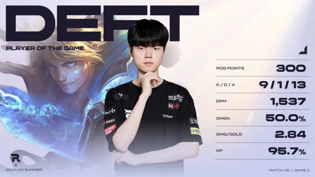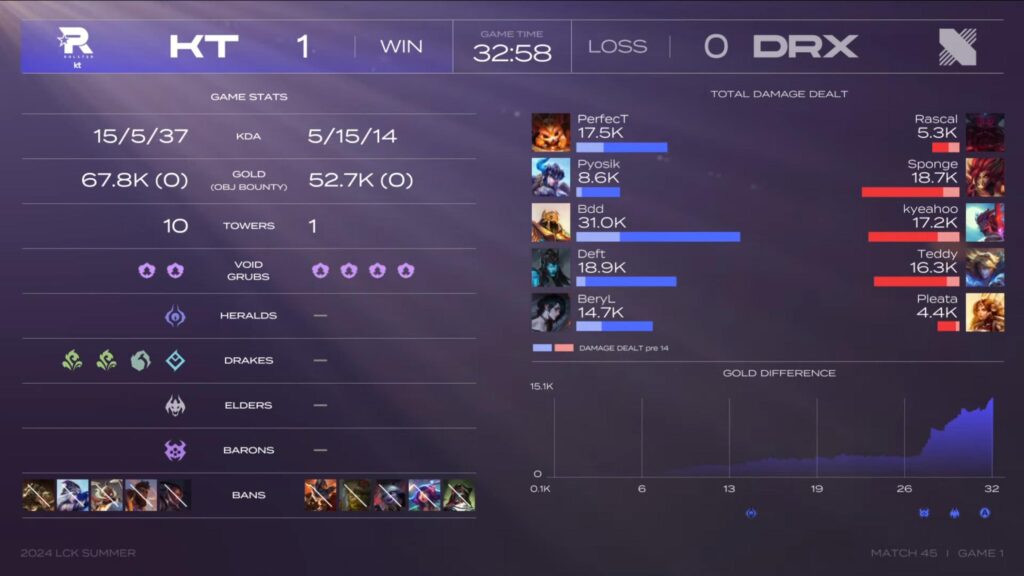 Ngày 19 tháng 7, tại LCK Arena ở Jongno-gu, Seoul, trong trận đấu cuối cùng của vòng 1 mùa giải thường LCK mùa hè 2024, KT Rolster đã đánh bại DRX với tỉ số 2-0. Kết quả vòng 1 của họ là 5 thắng 4 thua (+1), đứng ở vị trí thứ 6.