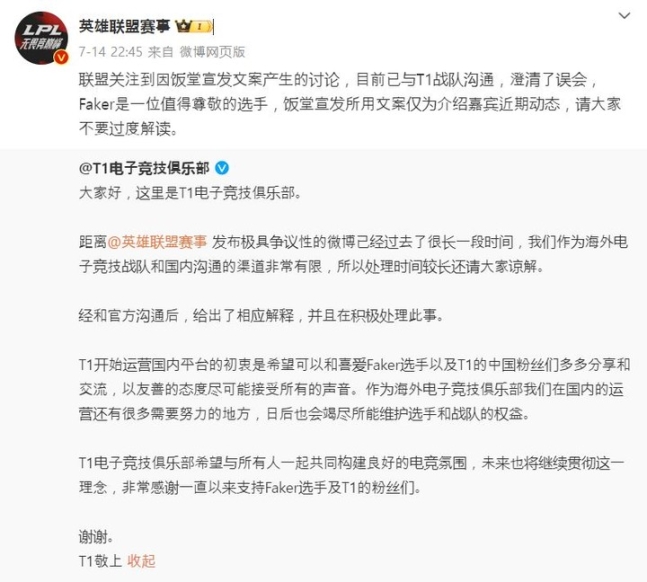 Ngày 14, T1 đã phản hồi rằng họ đã liên lạc với các bên liên quan, giải thích và đang hành động tích cực. Họ mong muốn giao lưu và chia sẻ nhiều hơn với fan Trung Quốc, và sẽ nỗ lực bảo vệ quyền lợi của đội và tuyển thủ. LPL cũng nhanh chóng đưa ra lời giải thích rằng họ nhận thức được tranh cãi này và đang cố gắng làm rõ hiểu lầm với T1. Faker là tuyển thủ đáng kính và bài viết chỉ nhằm giới thiệu các khách mời, không nên bị hiểu sai.