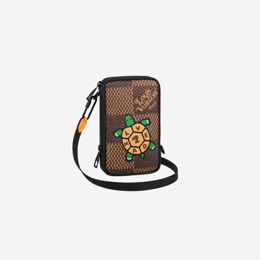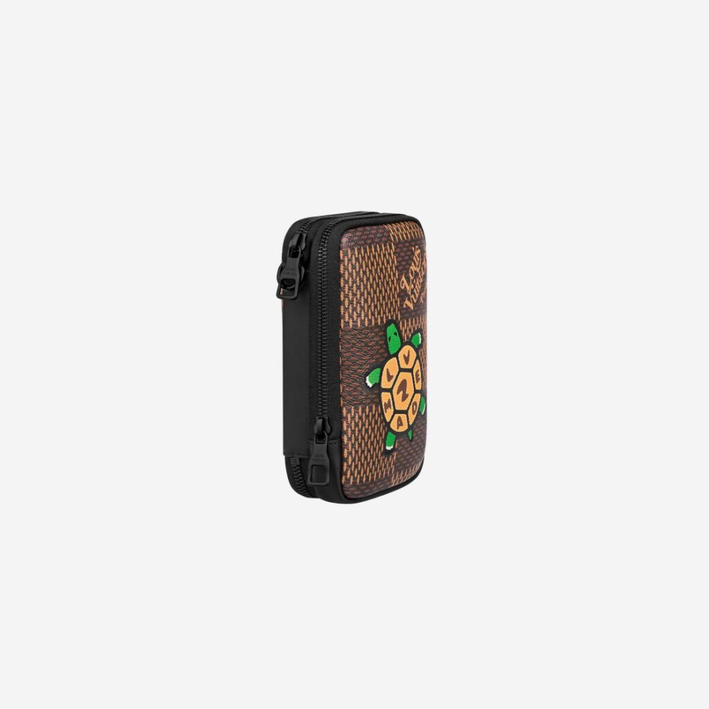Túi đựng điện thoại đôi được ra mắt với sự hợp tác của Nigo, là nhà sáng lập thương hiệu thời trang đường phố A Bathing Ape (BAPE) lừng lẫy của Nhật Bản. Chất liệu Damier Ebene. Có họa tiết 브랜드 가방 hình rùa với chữ LV Made trên vỏ. Không gian rộng rãi đựng vừa hai điện thoại di động. Mẫu thiết kế có thể đeo như 1 chiếc túi mini hoặc tháo rời để dùng làm ví cầm tay thuận tiện