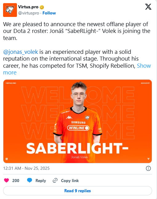 Ngày 2 tháng 12, trên các kênh truyền thông xã hội, Virtus.pro đã đưa ra thông báo: “Chúng tôi vui mừng thông báo tuyển thủ offlane mới nhất trong đội hình Dota 2 của mình: Jonáš ‘SabeRLighT-’ Volek sẽ gia nhập đội.” Tuyển thủ người Cộng hòa Séc này sẽ khoác lên mình màu áo cam quen thuộc của VP, thay thế vị trí offlaner trước đó là Nikita “Daxak” Kuzmin.